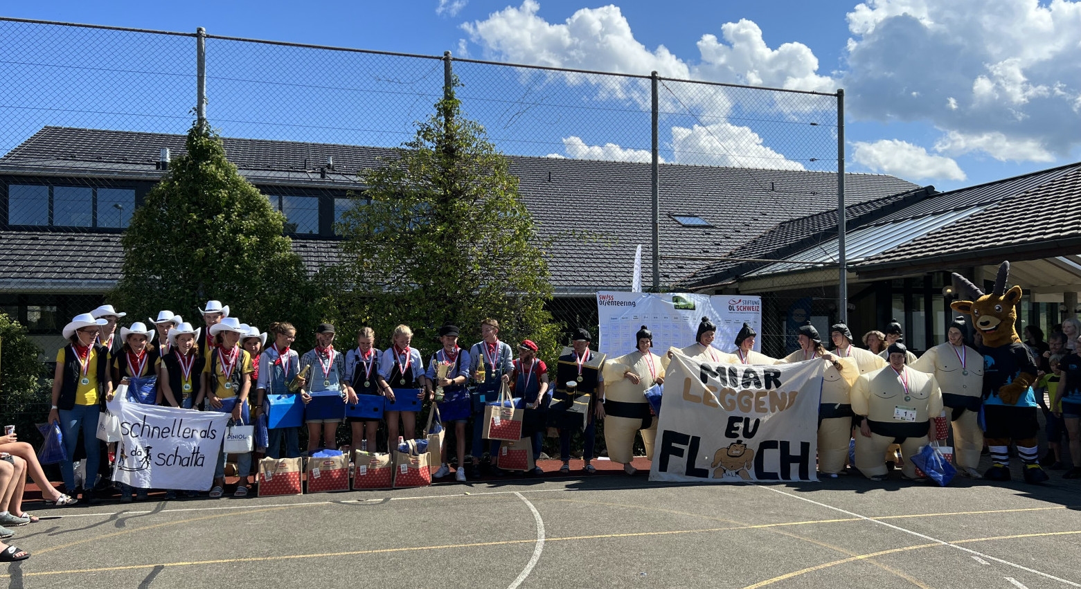 Nach einer mehr oder weniger erholsamen Nacht auf dem Turnhallenboden, mussten wir am Sonntagmorgen sehr früh aufstehen. Nach dem Frühstück in einem Restaurant, mit sensationell gutem Birchermüesli, machten wir uns auf zum Wettkampfzentrum. Nach dem historischen Staffelsieg der Frauen vom Samstag lagen wir nach dem ersten Wettkampftag auf Zwischenrang 2. Alles war somit noch offen und wir orientierten uns natürlich nach oben. Auf dem sehr langen Weg zum Start hiess es die Kräfte gut einzuteilen, denn danach erwarteten die Läufer eine Langdistanz, mit noch viel längerem Weg bis zum Ziel. Die Leistungen der Läufer des ersten Teams konnten sich auf diesem sehr langen Weg sehen lassen. Nach dem Mittagessen mit sehr leckerem Kuchen von Isabelle, die wieder einmal ungehorsam war, war es offiziell, dass das Zesolnak in der Endabrechnung den 3. Rang errungen hat. Zur Freude vieler durften wir uns somit wieder unsere Sumoringer Kostüme ankleiden. Unser Auftreten bei der Rangverkündigung wusste zu überzeugen und wir hatten die ganze Aufmerksamkeit der Zuschauer. Toll war auch, dass der neue Sponsor von Swiss Orienteering nach der Rangverkündigung ein erstes Mal auftrat. So konnten wir viele Emmi Produkte konsumieren und mit nach Hause nehmen. Danach neigte sich die diesjährige Jugendcup Ausgabe zum Ende zu und wir machten uns allmählich mit den Büsslis nach Hause auf. Als letztes kündeten wir jedoch noch die Rückkehr des Sieges am Jugendcup für nächstes Jahr an!