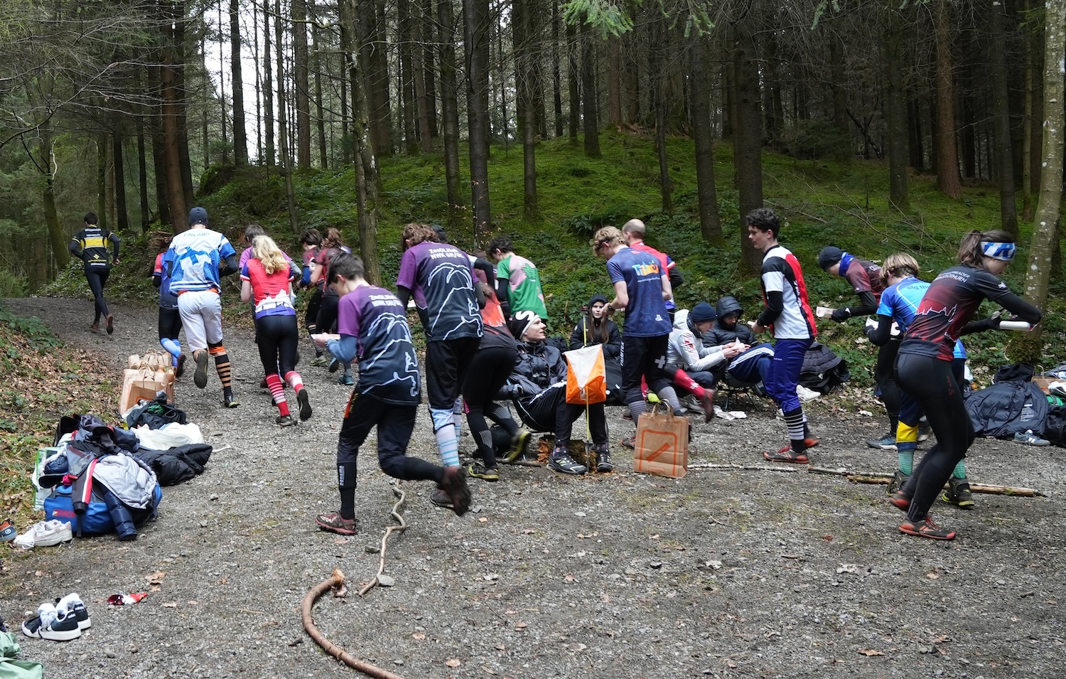 Dort teilten wir uns in vier Gruppen auf: Gruppe 1 Start, Gruppe 2 Ziel, Gruppe 3 Auswertung und Gruppe 4 WKZ/Info. Die Gruppen 1 und 2 machten sich mit dem Material auf den Weg ins Laufgelände, rund 45 Minuten und 250 Höhenmeter entfernt, und bereiteten dort Start und Ziel vor. Gleichzeitig richteten Gruppen 3 und 4 beim WKZ bei der Bergstation alles für Info und Auswertung ein.
